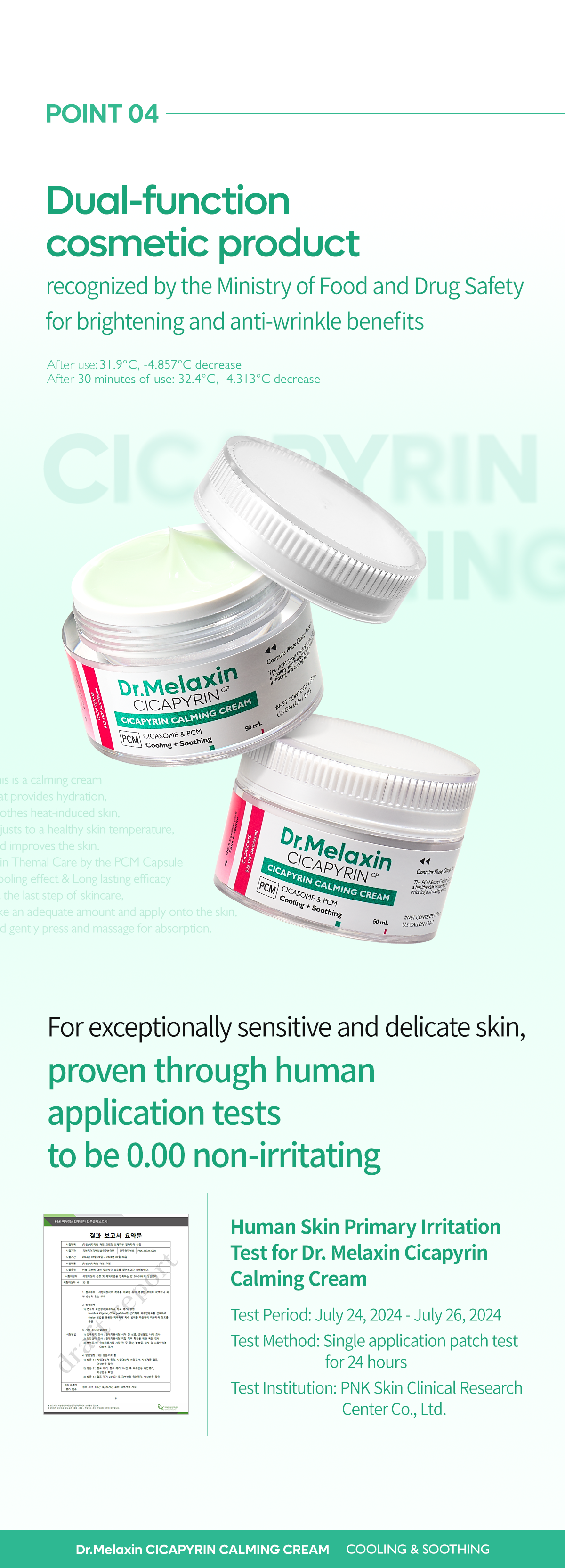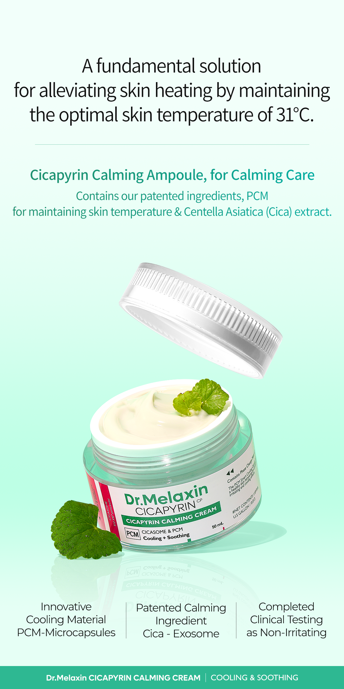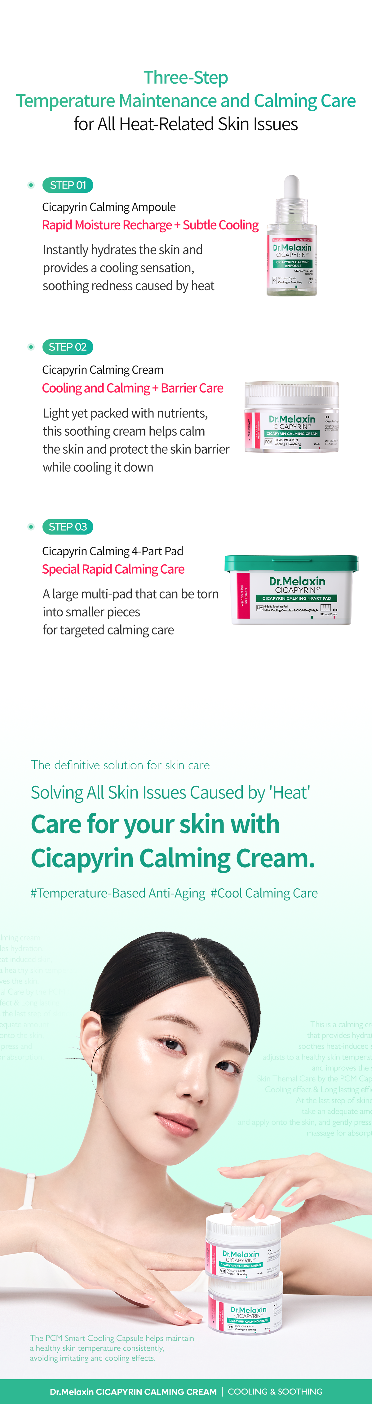 Experience the ultimate relief from skin heat with the CICAPYRIN CALMING LINE. Formulated with an advanced Cooling Care Complex, it is clinically proven to reduce skin temperature, providing long-lasting soothing effects while addressing the root cause of heat-induced skin troubles.