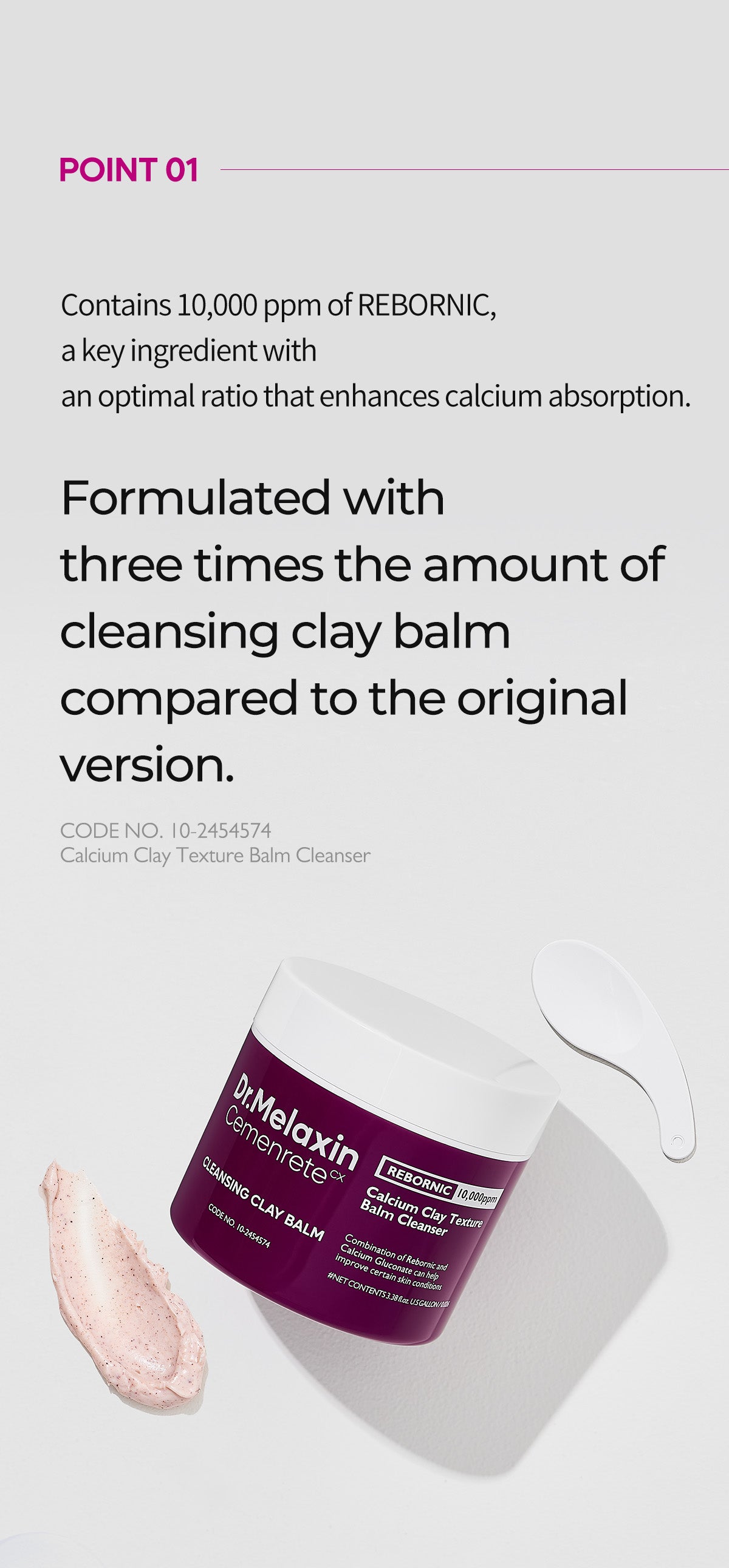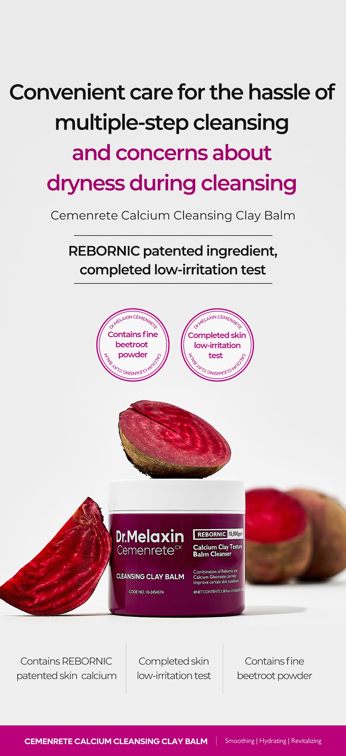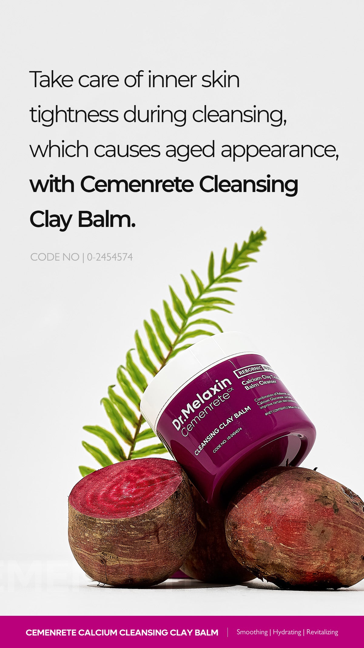 Simplify your cleansing routine with the Cemenrete Calcium Cleansing Clay Balm. This innovative formula contains 10,000 ppm of REBORNIC, a patented ingredient optimized to enhance calcium absorption. Enriched with fine beetroot powder, it effectively removes impurities with a single step, eliminating the need for double cleansing while maintaining hydration.