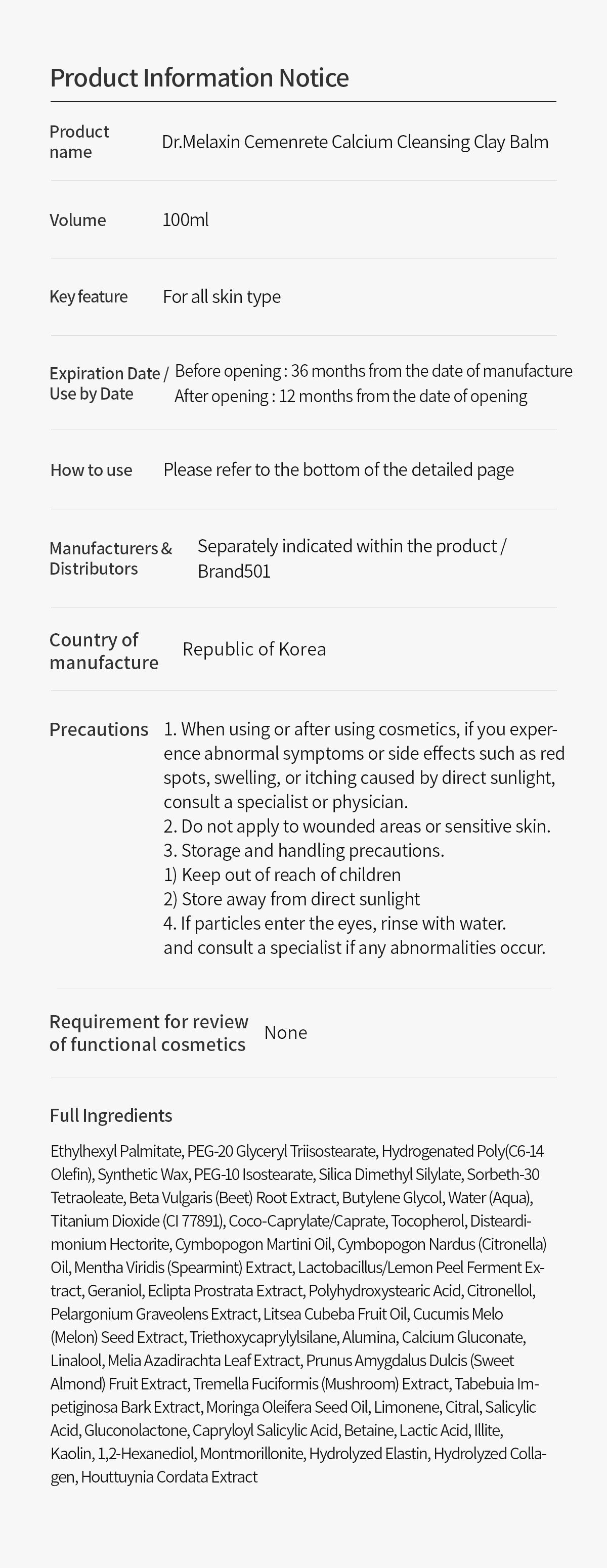 [Cemenrete Calcium Cleansing Clay Balm]Ethylhexyl Palmitate, PEG-20 Glyceryl Triisostearate, Hydrogenated Poly(C6-14 Olefin),Synthetic Wax, PEG-10 Isostearate, Silica Dimethyl Silylate, Sorbeth-30 Tetraoleate, Beta Vulgaris (Beet) Root Extract, Butylene Glycol, Water (Aqua), Titanium Dioxide (CI 77891),Coco-Caprylate/Caprate, Tocopherol, Disteardimonium Hectorite, Cymbopogon Martini Oil, Cymbopogon Nardus (Citronella) Oil, Mentha Viridis (Spearmint) Extract, Lactobacillus/Lemon Peel Ferment Extract,Geraniol, Eclipta Prostrata Extract, Polyhydroxystearic Acid, Citronellol, Pelargonium Graveolens Extract, Litsea Cubeba Fruit Oil, Cucumis Melo (Melon) Seed Extract, Triethoxycaprylylsilane, Alumina, Calcium Gluconate, Linalool, Melia Azadirachta Leaf Extract, Prunus Amygdalus Dulcis (Sweet Almond) Fruit Extract,Tremella Fuciformis (Mushroom) Extract, Tabebuia Impetiginosa Bark Extract, Moringa Oleifera Seed Oil,Limonene, Citral, Salicylic Acid, Gluconolactone, Capryloyl Salicylic Acid, Betaine, Lactic Acid, Illite, Kaolin, 1,2-Hexanediol, Montmorillonite, Hydrolyzed Elastin, Hydrolyzed Collagen, Houttuynia Cordata Extract.