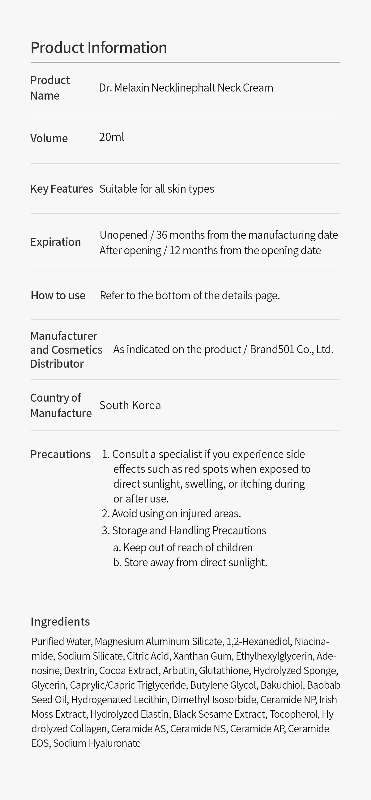 [Necklinephalt Neck Cream/20ml]Purified Water, Magnesium Aluminum Silicate, 1,2-Hexanediol, Niacinamide, Sodium Silicate, Citric Acid, Xanthan Gum, Ethylhexylglycerin, Adenosine, Dextrin, Cocoa Extract, Arbutin, Glutathione, Hydrolyzed Sponge, Glycerin, Caprylic/Capric Triglyceride, Butylene Glycol, Bakuchiol, Baobab Seed Oil, Hydrogenated Lecithin, Dimethyl Isosorbide, Ceramide NP, Irish Moss Extract, Hydrolyzed Elastin, Black Sesame Extract, Tocopherol, Hydrolyzed Collagen, Ceramide AS, Ceramide NS, Ceramide AP, Ceramide EOS, Sodium Hyaluronate.